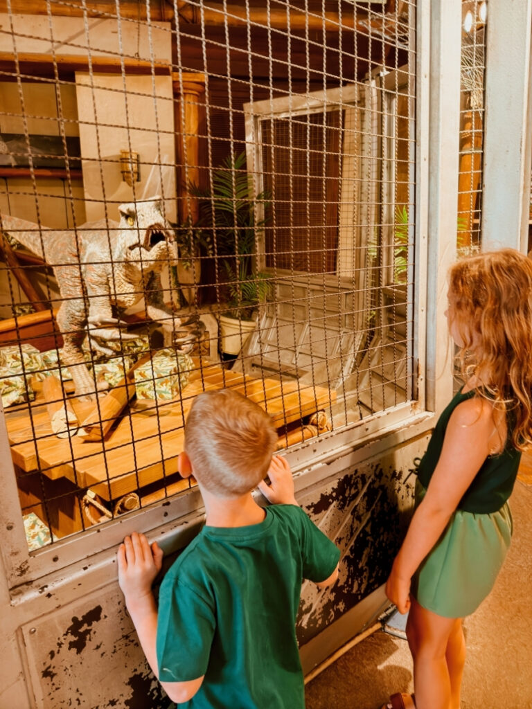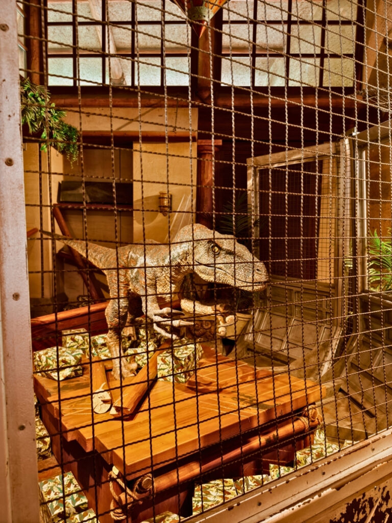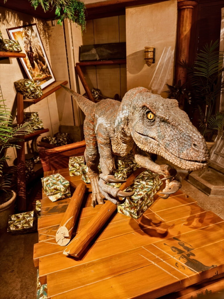 Inside the Discovery Centre is my favourite part of the Jurassic area, it’s an anamatronic Raptor that moves and possibly reacts to you. Very cool. Fortunately, he’s behind bars so we don’t need to keep an eye on him when we turn our backs.