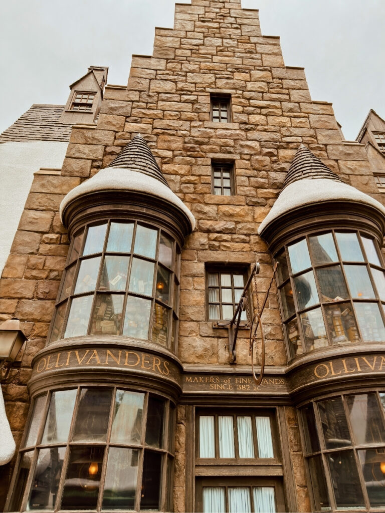 After you’ve been on the rides, and refuelled if necessary, I suggest that the first shops you should visit are Ollivanders and Wiseacre’s Wizarding Equipment which are side-by-side.